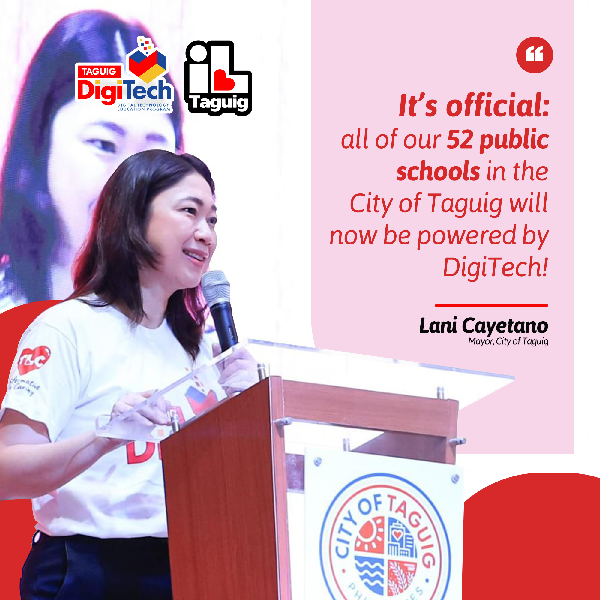 The Taguig DigiTech program aims to provide the latest technology in education through an engaging, interactive, accessible, and learning environment for students and teachers across all 52 public schools in the City. As part of this initiative, three new facilities were officially launched at Senator Renato "Compañero" Cayetano Memorial Science and Technology High School (SRCCMSTHS). These facilities are a Robotics Lab, a Digital Classroom, and a Digital Computer Lab.